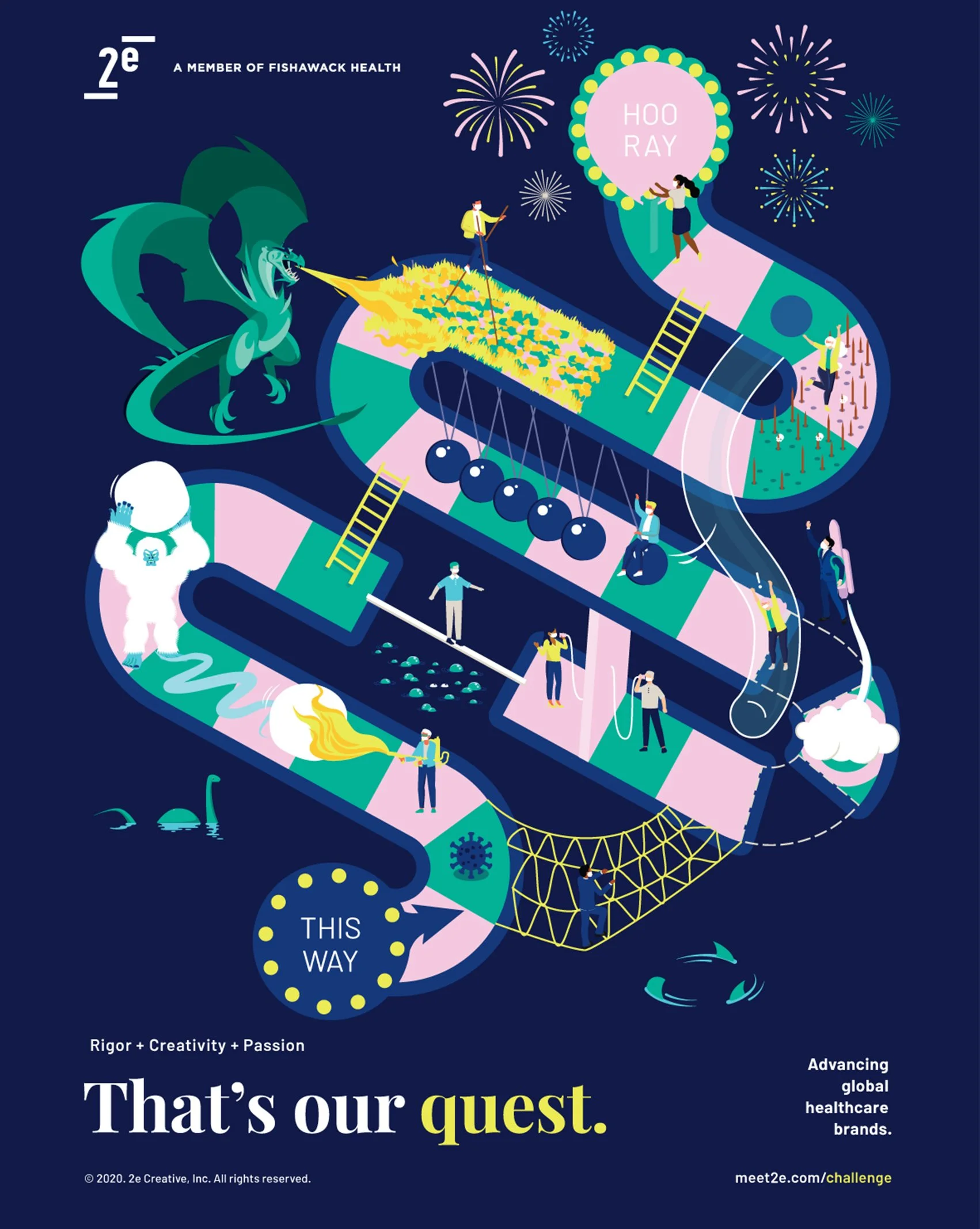 We created a whimsical approach to convey how 2e develops compelling messaging with creativity along with intelligence and the rigor of staying within regulatory lanes mandated by the FDA and other entities.